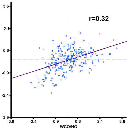 Moran’s I correlation index between WCO and HO values. The 0.32 value of the index reveals that there was no substantial correlation.