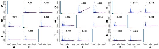Spatial correlation of two variables between different biomass sources (A: point sources, B: arable crops, C: greenhouse crops, D: tree crops, E: vineyards, F: forests).