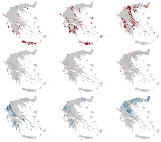 - The methodology used in this study was applied for the first time to analyze this problem. Despite its originality, it involves several limitations and challenges. One of these is that spatial analysis carries significant constraints when geographical units have unique characteristics. For example, the presence of numerous islands in the Greek case leads to distorted estimates of indicators such as Moran’s I and others in these regions. Additionally, while the methodology provides a general overview of the problem, it cannot accurately determine a future collection and transportation chain, as other methodologies can. These limitations present challenges for the methodology, which will be the subject of future research.