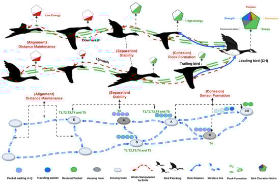 - Antoniou, P.; Pitsillides, A.; Blackwell, T.; Engelbrecht, A.; Michael, L. Congestion control in wireless sensor networks based on bird flocking behavior. Comput. Netw. 2013, 57, 1167–1191. Available online: https://www.sciencedirect.com/science/article/pii/S1389128612004112 (accessed on 27 November 2024). [CrossRef]
