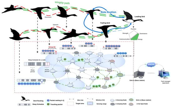 This algorithm is widely applied in WSNs for energy-efficient routing, swarm robotics and UAV path planning, as well as various optimization problems []. This algorithm is especially effective in situations requiring distributed, decentralized control, enabling nodes to adapt naturally to environmental changes or network conditions, much like birds flocking together [,]. By incorporating natural flocking behavior into the WSN model, the Bird Flocking Node Scheduling algorithm is developed to tackle multi-objective optimization challenges, such as energy conservation, connectivity, and extending network lifetime.