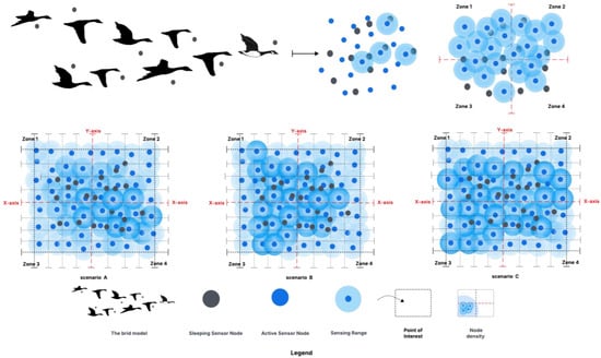 Furthermore, network lifetime is defined as the period during which the sensor nodes can sustain a connected coverage state, ensuring the expected operational functionality of the WSN. Figure 3 illustrates potential spatial coverage scenarios, highlighting variations in node density randomly distributed within different zones of the monitored area.