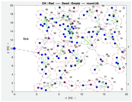 Simulation Setup for the Bird Node Scheduling Algorithm (Red node—cluster head; Blue node—child node; Empty node—dead node).