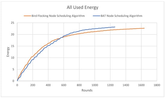 The used energy metric assesses network energy consumption over the simulation rounds. Figure 5 illustrates this metric, with the Y-axis representing the energy expended by nodes and the X-axis indicating the round number. The Bird Flocking Node Scheduling algorithm demonstrated superior energy efficiency compared to the BAT node scheduling algorithm, meeting performance requirements.