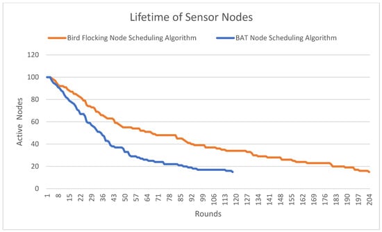 The lifetime of a sensor node is evaluated by monitoring the number of active nodes across simulation rounds. In this analysis, the Y-axis represents the count of active nodes, while the X-axis indicates the simulation rounds. As illustrated in Figure 6, the Bird Flocking Node Scheduling algorithm demonstrates a significant improvement in energy efficiency and node longevity. Specifically, 16 nodes remain active at the 203rd rounds when using the Bird Flocking Node Scheduling algorithm, whereas with the BAT node scheduling algorithm, only 16 nodes remain at the 117th rounds.