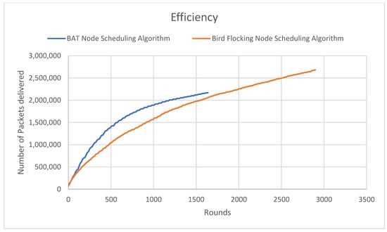 Figure 7 illustrates that, in the early stages, between 0 and 1500 rounds, the BAT algorithm initially delivers more packets than Bird Flocking Node Scheduling, suggesting higher short-term efficiency. However, this rapid packet transmission may lead to aggressive energy consumption, potentially causing quicker node depletion. In contrast, beyond 1500 rounds, the Bird Flocking Node Scheduling algorithm begins to outperform the BAT algorithm in terms of packet delivery, surpassing it around the 1600th round. While the BAT algorithm begins to plateau, Bird Flocking Node Scheduling maintains a steady, long-term increase in packet delivery, eventually reaching approximately 2,681,517 packets by the 2898th round. This suggests that Bird Flocking Node Scheduling optimizes energy consumption, keeping nodes active for a longer period and ensuring sustained network operation.