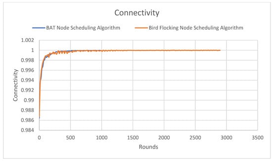 As observed in Figure 8, from the 336th to the 2884th rounds, the Bird Flocking Node Scheduling algorithm maintained a connectivity value of 1, which indicates that the network remained fully active with superior connectivity. The fluctuations in the setup costs were observed for both algorithms, e.g., the BAT algorithm experienced fluctuation between round 28 and 420, and the Bird Flocking Node Scheduling algorithm between round 84 and 500. These fluctuations can be attributed to the initial synchronization, node activation patterns, and energy management strategies. Both algorithms experience these variations as they adjust to optimize energy usage, and connectivity. However, the Lyapunov function helps stabilize these adjustments by enforcing gradual energy depletion, which prevents sudden failures or energy overuse.