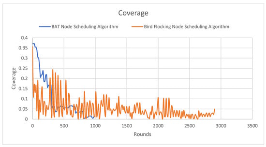 Figure 9 compares the coverage performance of the Bird Flocking Node Scheduling algorithm and the BAT node scheduling algorithm over multiple simulation rounds. Quantitatively, the BAT algorithm begins with a high initial coverage of approximately 0.37 but experiences a steep decline, falling below 0.1 by the 200th round and nearing zero around the 900th round, indicating rapid depletion of sensing capacity. In contrast, the BFNS algorithm starts with a lower but more stable coverage range between 0.10 and 0.15, exhibiting consistent fluctuations due to its adaptive sleep/wake scheduling. Even beyond the 1500th round, Bird Flocking Node Scheduling algorithm maintains intermittent coverage spikes between 0.01 and 0.07, demonstrating sustained sensing capability up to the 3000th round, long after the BAT algorithm fails. This behavior reflects the impact of the Lyapunov function in ensuring stability—by guiding energy-aware scheduling decisions, it prevents abrupt performance collapse and keeps the system operating within bounded, acceptable ranges. The observed oscillations in Bird Flocking Node Scheduling algorithm coverage confirm the system’s ability to adapt under constraints, ensuring prolonged service availability and resilient network behavior.