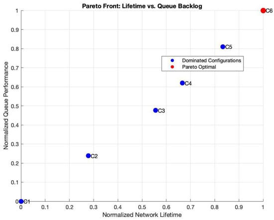 Figure 10 visualizes the trade-offs between two competing objectives: normalized network lifetime (e.g., lifetime, coverage, and connectivity) and normalized queue backlog (e.g., data delay or throughput). The goal here is to visualize how different scheduling strategies affect the performance of the above-mentioned metrics. The six WSN scheduling configurations (C1–C6) are analyzed in Figure 10 using a Pareto Front approach, highlighting the trade-offs between network lifetime and queue backlog. Higher coverage reduces holes but increases energy drain, while stronger connectivity prevents data loss at the cost of greater energy expenditure from more active nodes. The Pareto optimal solutions demonstrate that improving one metric often degrades another, and configurations minimizing backlog (like C6) typically shorten network lifetime, whereas those maximizing lifetime (like C1) tolerate higher congestion. This analysis enables the selection of the most suitable scheduling strategy based on application priorities, whether emphasizing longer network lifetime, data throughput, full network coverage, or communication reliability, with normalized metrics facilitating direct comparison across all performance dimensions. This has been explained in Table 3.