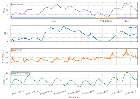 A selected data window spanning from 2023-01-30 12:00 to 2023-02-08 12:00 was divided into training, validation, and test subsets, following standard practices in machine-learning workflows [14,26]. As the preprocessed data were uniformly resampled at a one-minute resolution, each full day contains samples. The specific temporal split for each subset is described as follows:
