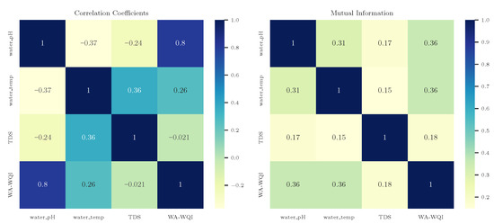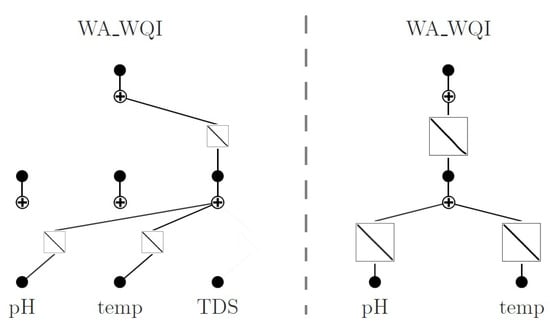 This work presents two case studies, each defined by a distinct WQI aggregation function adopted as the prediction target. The first is the weighted arithmetic WQI (WA-WQI), and the second is the weighted quadratic mean WQI (WQM-WQI) [8,16]. These formulations were chosen not only for their conceptual simplicity and interpretability but also to allow comparative analysis under linear and nonlinear aggregation structures. The WA-WQI was selected for the initial case study, serving as a benchmark due to its wide adoption and transparent computation. Its formulation is shown in Equation (1), where i indexes the input variables (pH, TDS, and temperature), and denotes the total number of variables.