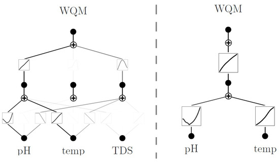 For the second case study (WQM-WQI prediction), the symbolic expressions extracted from the original and pruned models are considerably more complex due to the nonlinear nature of the target function, as illustrated in Equations (12) and (13). To improve readability, the expressions have been reformatted as follows.