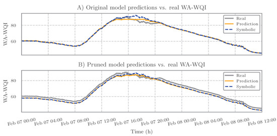 Comparison of predictions and symbolic expressions against the real WA-WQI values over the test period. (A) Results from the original model show a good match between predicted and symbolic values. (B) The pruned model and its symbolic expression exhibit an almost identical output, reflecting the model’s convergence to a simplified but highly accurate analytical form. This result highlights the ability of KAN to recover interpretable expressions with minimal loss in performance.