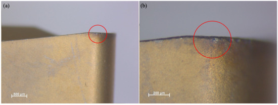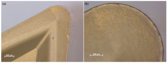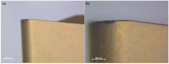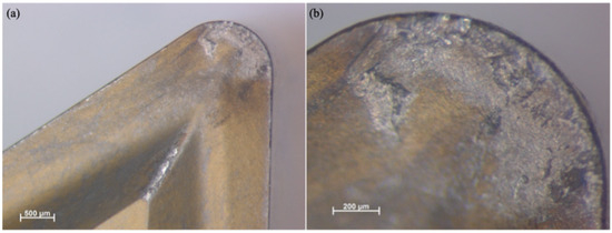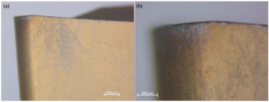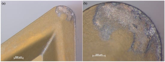 Similarly, Figure 2 presents the functional (f-side) plane view of the tool insert. This side is responsible for removing the initial material during the machining operation. A Discovery V8 microscope (Carl Zeiss Microscopy GmbH, Jena, Germany) was used to capture the images at two different magnifications, 25× and 80×. The enlarged pictures offer a clearer view of the wear on the tool.