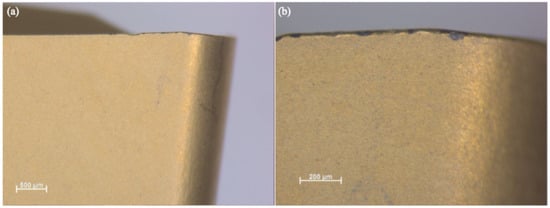 Comparison of the HAZ in tool inserts, f-plane view, M = 80×: (a) dry machining, (b) wet machining.