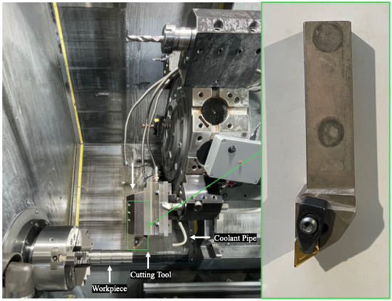 The machine used for performing the experiment is a HAAS ST-20Y CNC machine (Haas Automation, Inc., Leoben, Austria) [21]. The coolant used during the wet condition is a 5% CIKS HKF 420 oil emulsion. The cutting parameters were selected based on the workpiece’s characteristics and the cutting tool’s properties. The manufacturer’s guide for the tool insert provides suitable cutting parameters with spindle speed up to (Ns) 2000 rpm, feed (f) 0.1 mm/rev, and depth of cut up to 2 mm. In previous work, these parameters were examined, and it was concluded that the varying depth of cut plays a minor role in impacting the quality. The previous work parameters were used as a reference [22]. The spindle speed (Ns)) was varied at three levels: 1000 rpm (vc—141.4 m/min), 1500 rpm (vc—212.1 m/min), and 2000 rpm (vc—282.7 m/min). The spindle speed was chosen because it is easy to control during the operation. The operator can easily change it in the code. Feed (f) is varied at two levels, 0.1 and 0.3 mm/rev, and depth of cut (ap) is varied at one level. Two environments were chosen—dry and wet machining conditions.