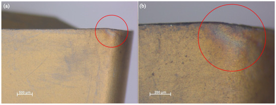 The front-side view of the tool insert for wet machining conditions is shown in Figure 8a,b. A small, localized HAZ zone is visible, marked with red circles. It is much smaller compared to dry machining conditions. The coating remains unscratched. No material loss can be seen.