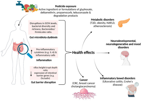 While a comprehensive examination of the mechanisms linking gut dysbiosis, inflammation, and metabolic disturbances to cancer is beyond the scope of this review, an overview of each can effectively highlight the pathways through which pesticide exposure may contribute directly or indirectly to carcinogenesis or cancer progression. It is important to note that further research is necessary to establish a definitive connection between pesticide exposure and cancer through these mechanisms.