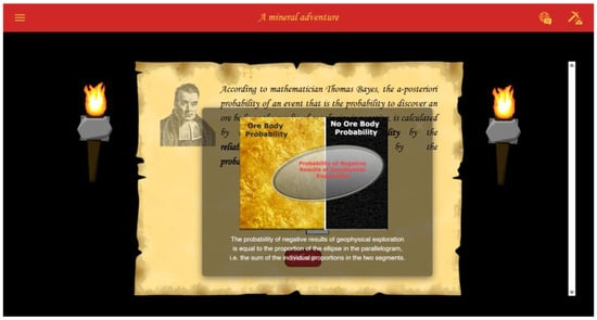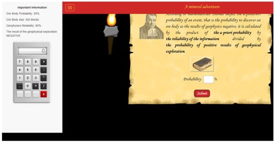 The application features a graphical user interface inspired by a treasure hunt theme, complete with papyrus and flaming torch visuals. Sound effects enhance user engagement, with specific sounds assigned to actions like button presses, the flaming torches, the geophysical research process, drilling, ore reserve estimation, and the exploitation process. The final score is also accompanied by suitable emotional sound effects. Interactive animations highlight the geophysical research and the extraction of blocks, whether they contain ore or not. The user interface is designed to maintain a level of mystery, aligning the application with serious gaming criteria. It includes step-by-step guidance through visual and textual clues available in a popup sidebar, which also houses a calculator for computing the required a posteriori probability (Figure 2).