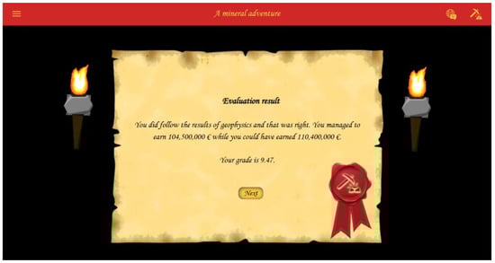 After the exploration campaign, if the learner believes that the results are encouraging, they have the option to proceed with the exploitation of the field. If this path is chosen, the feasibility study reveals that the cut-off grade of the useful ingredient is 10%, the selling price of the ore is €200 per ton, its specific weight is 2 g/cm3, and the extraction cost for each block is estimated at €500,000. By selecting a block, the learner automatically proceeds to extract it and then dispatches it for further processing and sale if its actual grade exceeds the marginal value; otherwise, it is deposited in the pile of barren (Figure 5). The learner can mine up to all the blocks available to them but must also monitor their current balance. They can cease mining at any time, which allows them to be informed about their performance score. The final score is calculated based on the profit from the sale of the ore mined, compared to the optimal potential profit. Consideration is also given to whether they have adhered to the principles governing mineral research (Figure 6).
