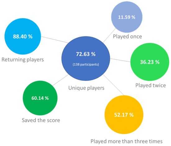 The participants agreed that the application meets the educational objectives by offering an engaging and enjoyable experience. The high participation and multiple runs of the game confirm the application’s attractiveness. Based on the database of the game, 72.63% of the participants played the game, while 88.40% of them reentered the game and 60.14% saved their score. Only 11.59% played the game once, 36.23% twice, and 52.17% more than three times (Figure 7).