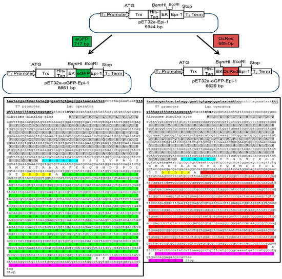 The Escherichia coli (E. coli) DH5α strain was used for cloning. Restriction enzymes (BamHI, EcoRI, XhoI) and T4 DNA ligase were obtained from New England Biolabs (Ipswich, MA, USA). The plasmid vector pET-32a-Epi-1, previously described in [19], was used for cloning the eGFP and DsRed genes in the upstream of antimicrobial peptide Epi-1. Luria–Bertani (LB) broth and agar were purchased from Sigma-Aldrich (Millipore Sigma Burlington, MA, USA).