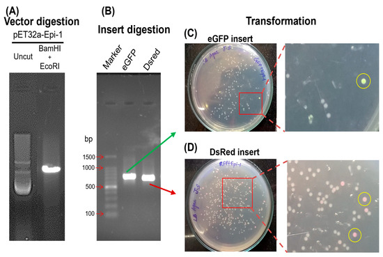 The image illustrates the molecular cloning steps involved in creating fluorescent Epi-1 gene clones. (A). The experiment began with the digestion of the pET32a-Epi-1 vector using BamHI and EcoRI. Restriction digestion yielded a single linear band, while the uncut vector displayed supercoiled, nicked circular, and intact circular forms. (B). The eGFP and DsRed inserts were PCR-amplified and digested with the same restriction enzyme pairs. The vector and fluorescent gene inserts were then ligated individually and transformed into competent cells via heat shock, followed by plating on fresh ampicillin-containing LB agar. (C,D). After 48 h of incubation, colonies that successfully took up the recombinant plasmids exhibited fluorescence corresponding to their respective inserts. The zoomed-in view shows the transformed colonies. The fluorescent colonies which are circled in yellow, indicate successful transformation. The original vector digestion agarose gel image is shown in Supplementary Figure S1.