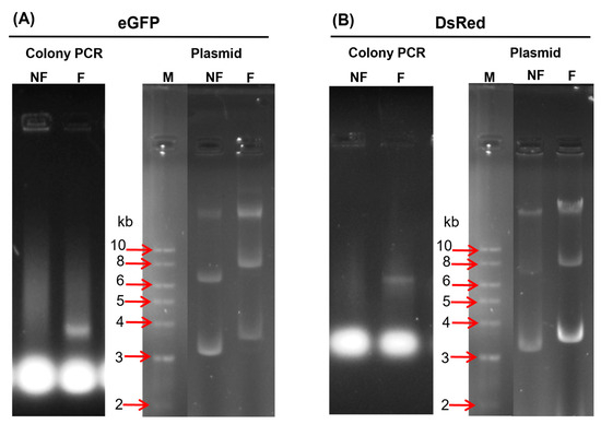 (A,B). PCR and plasmid migration assay to validate the eGFP-epi-1 and DsRed-epi-1, which were fluorescent screened in the previous figure. The figure shows agarose gel electrophoresis images of PCR (insert-specific and spanning PCR) and plasmid isolated from individual clones of eGFP-Epi-1 and DsRed-Epi-1 and grouped individually. The individual NF—nonfluorescent colonies and F—fluorescent colonies are shown for representation. M—represents the molecular weight DNA ladder. For insert PCR, the DNA isolated from the fluorescent colonies showed amplification with the corresponding eGFP and DsRed primers. For spanning PCR, the forward primer of the fluorescent gene and the reverse primer of Epi-1 were used. The fluorescent colonies showed amplification and the non-fluorescent colonies did not show amplification. The size of the amplicon for eGFP-epi-1 is (717 + 84 = 801 bp) and for DsRed-Epi-1 is (685 + 84 = 769 bp). The plasmids isolated from fluorescent (F) colonies migrate slower than those from the non-fluorescent (NF) colonies. This is because the non-fluorescent colonies have the same vector size (pET32a-Epi-1: 5944 bp). The fluorescent colonies have a high number of bases due to the insertion of fluorescent genes. eGFP-Epi-1: 6661 bp and DsRed-Epi-1: 6629 bp. The original agarose gel images are shown in Supplementary Figure S2a–d.