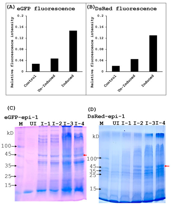 (A,B) show the fluorescence intensity measurements for eGFP and DsRed, respectively. Control refers to lysates from E. coli expressing pET32a-epinecidin-1 without a fluorescent tag. Un-Induced and Induced refer to lysates from cells harboring the respective fusion constructs before and after IPTG induction. (C,D) present SDS-PAGE profiles of eGFP-epi-1 and DsRed-epi-1 expression over time. Lane M represents the protein molecular weight marker, while UI corresponds to lysates from un-induced cultures. Lanes I-1 to I-4 show lysates collected at 1, 2, 3, and 4 h post-induction with 0.3 mM IPTG. The red arrows indicate the expected bands for the induced fusion proteins. Based on amino acid sequence analysis using ProtParam, the calculated molecular weights are approximately 47.88 kDa for eGFP-epi-1 (431 amino acids) and 46.65 kDa for DsRed-epi-1 (417 amino acids).