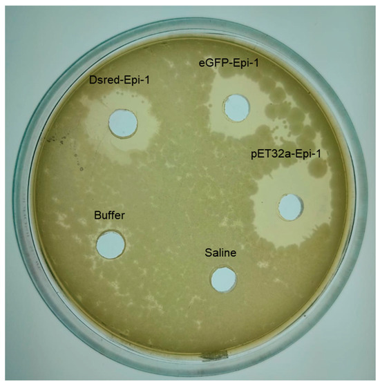 To validate the bioactivity of eGFP-Epi-1 and DsRed-Epi-1, an agar well diffusion assay was performed using Staphylococcus aureus (ATCC 25923). Figure 5 illustrates the assay results, including wells containing buffer (vehicle control), saline (growth control), and epinecidin-1 protein expressed from pET32a-Epi, as well as the fusion proteins eGFP-Epi-1 and DsRed-Epi-1. Clear zones of inhibition were observed around the wells containing pET32a-Epi, eGFP-Epi-1, and DsRed-Epi-1, indicating antibacterial activity. These results suggest that fusion of epinecidin-1 with fluorescent tags (eGFP or DsRed) does not compromise the antimicrobial function of the peptide.