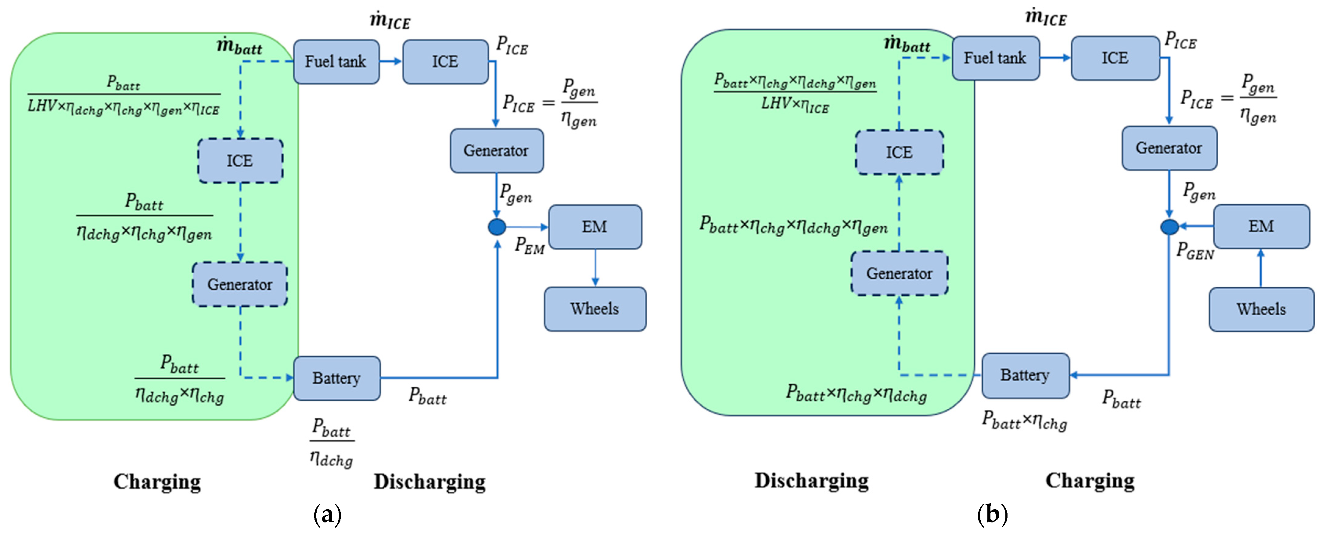 - < 0, battery charging mode:where and are the equivalence factors for battery charging and discharging operations, respectively ; is the low heating value of fuel, .