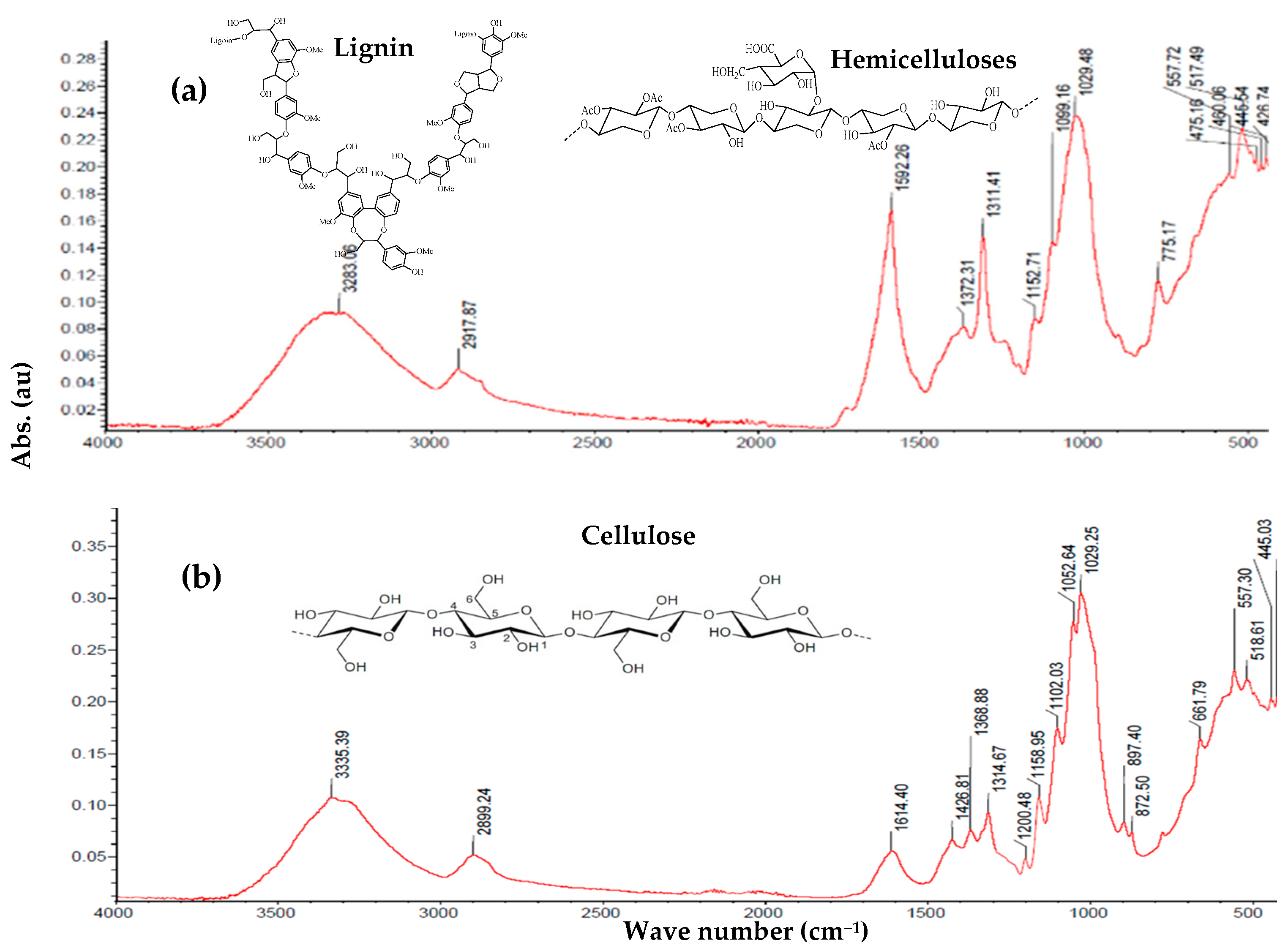 | 1335–1200 | Skeletal vibrations of rings in syringyl and guaiacyl units; asymmetric stretching vibrations between Ar-O-C; stretching vibrations of phenolic C-O. | Bending vibrations of C-H; axial deformation vibrations in C-H of CH2 groups; in-plane bending vibrations of O-H groups. | |