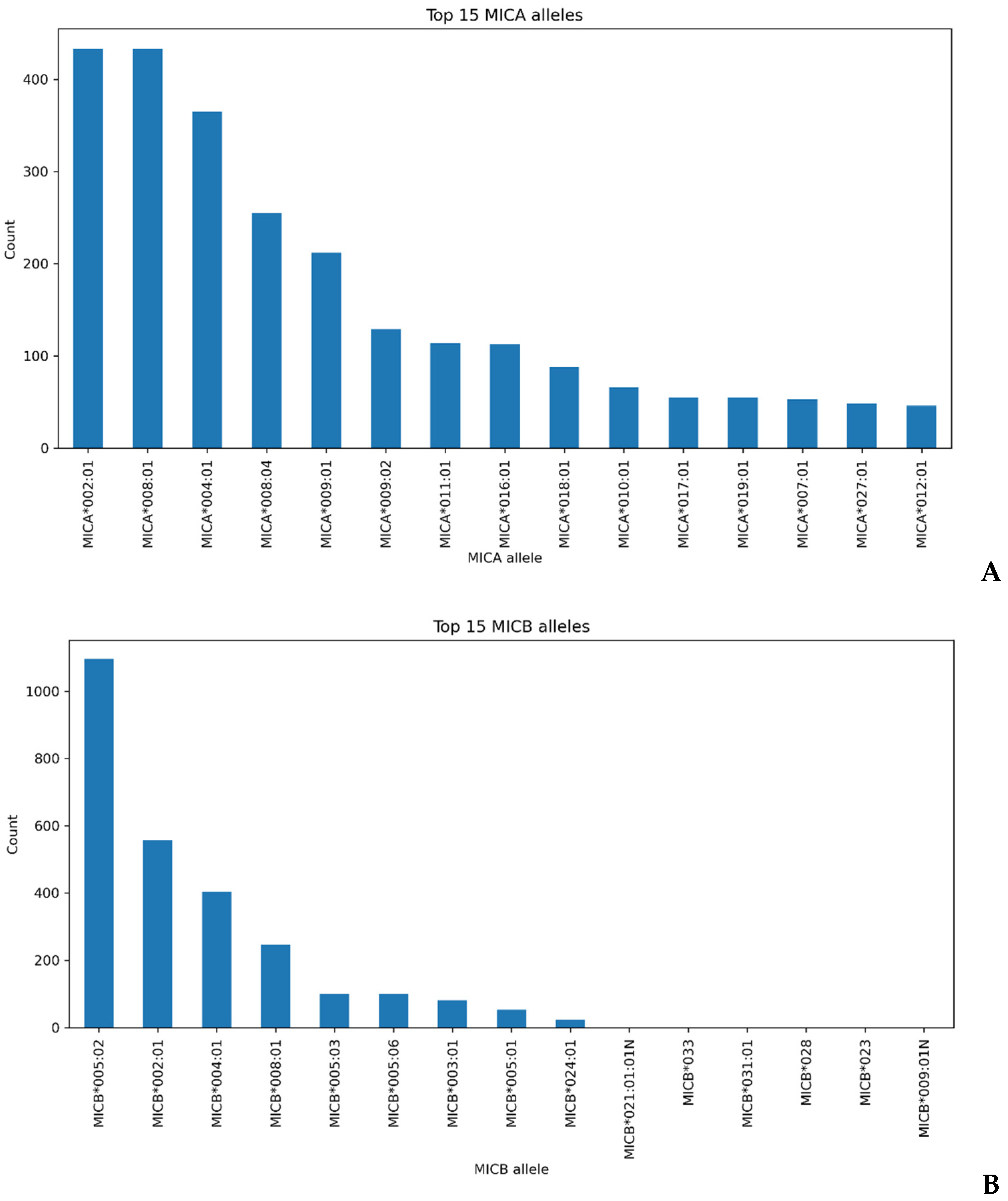 Table 1). At the MICA locus, the most frequent alleles were MICA*002:01 and MICA*008:01, each accounting for approximately 16.9% of all observed MICA allele copies in the cohort, followed by MICA*004:01 (14.3%), MICA*008:04 (10.0%) and MICA*009:01 (8.3%). At MICB, MICB*005:02 predominated and represented 41.2% of all MICB allele copies, with MICB*002:01 (20.9%), MICB*004:01 (15.2%), MICB*008:01 (9.2%) and MICB*005:03 (3.8%) forming a second tier of common variants.