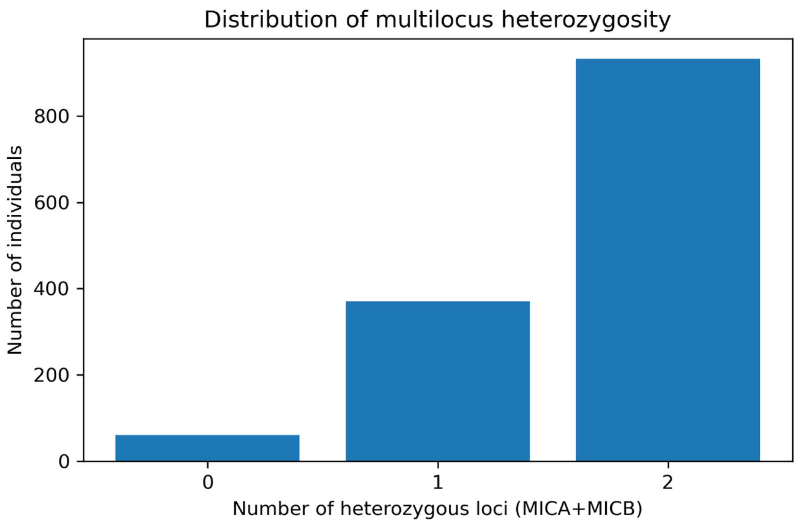 Table 2). At the individual level, multilocus heterozygosity exemplified the richness of non-classical MHC variation in this population: 932 individuals (68.3%) were heterozygous at both loci, 371 (27.2%) were heterozygous at one locus only, and only 61 (4.5%) were homozygous at both MICA and MICB (