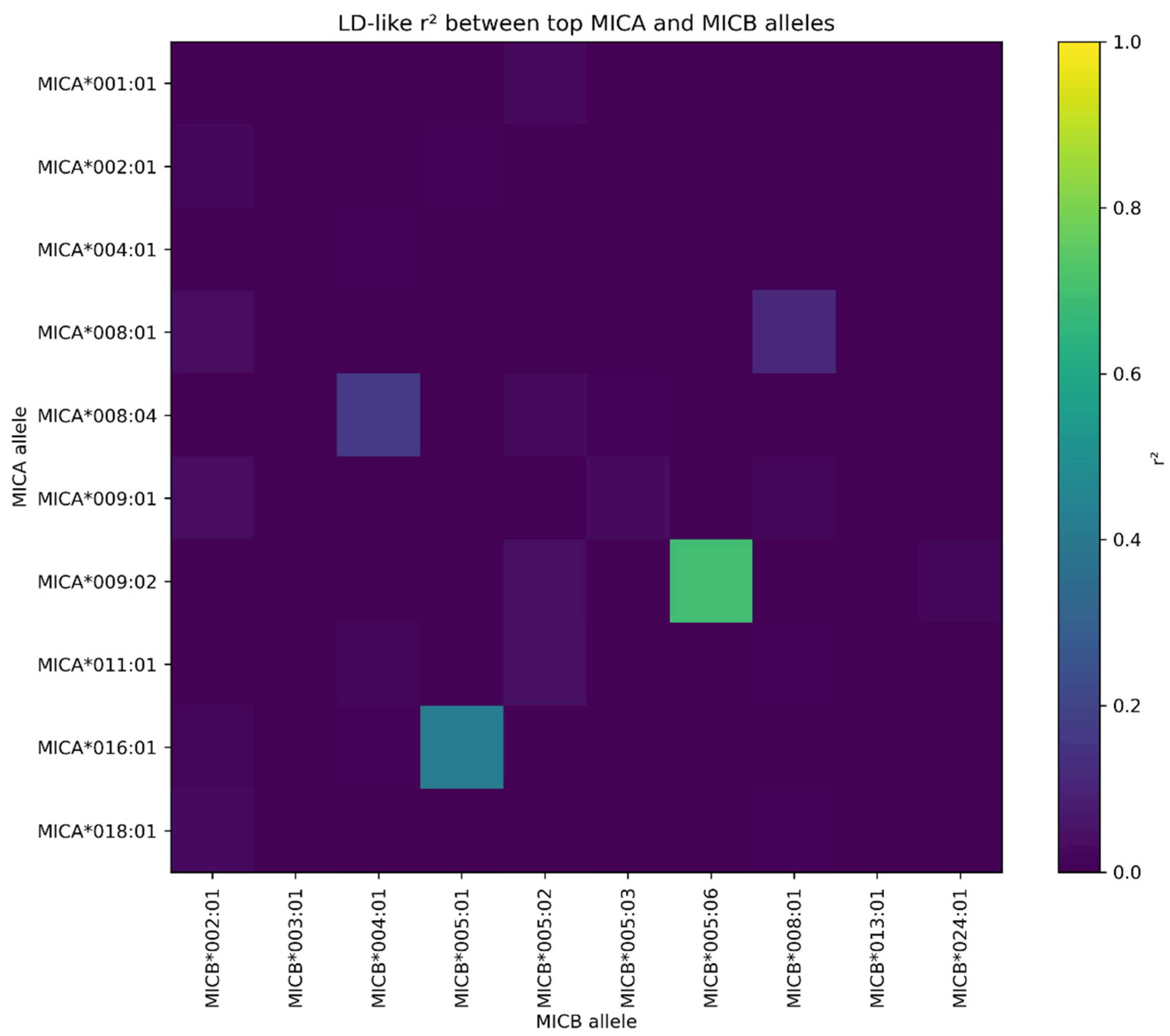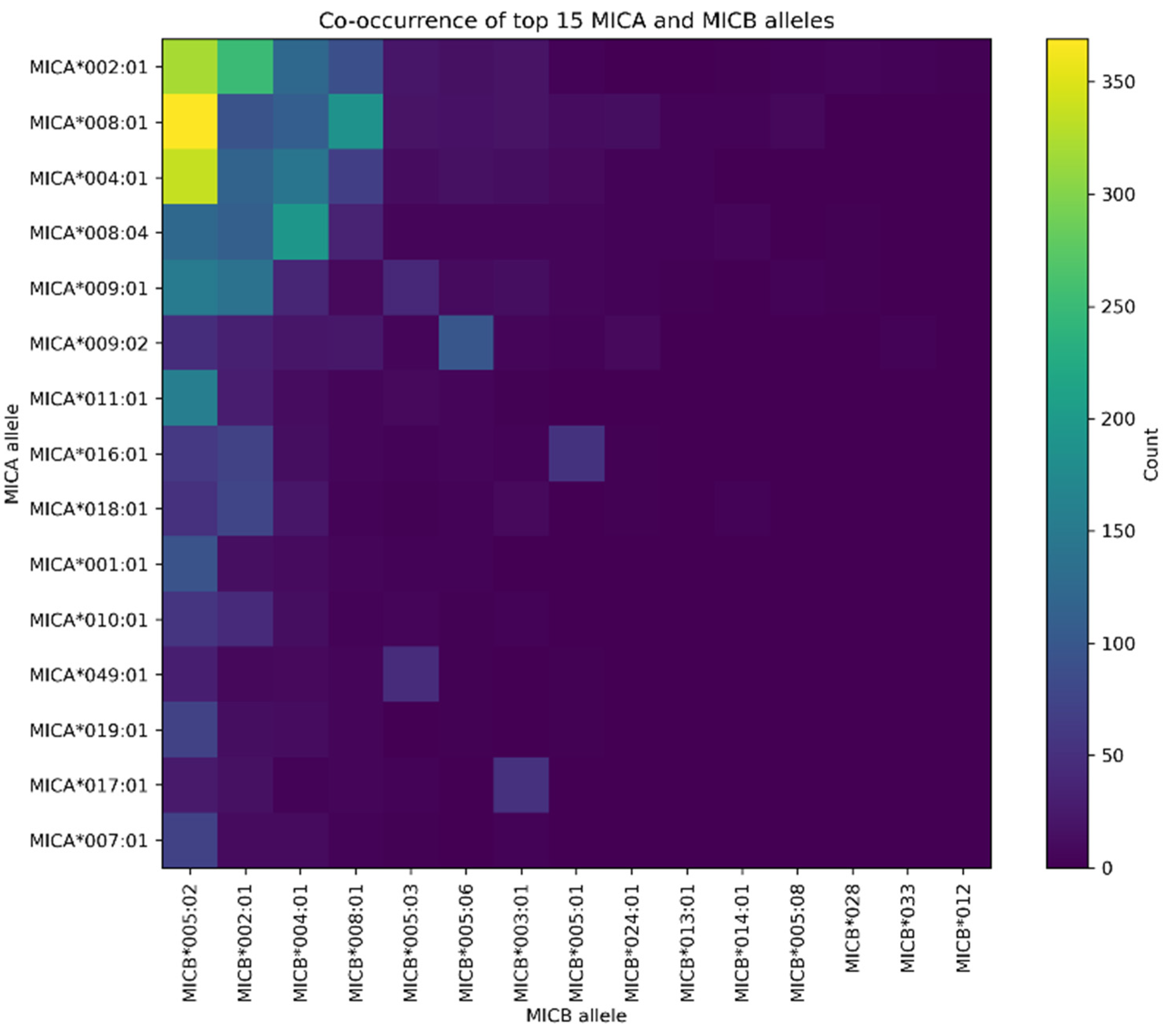 The relationship between MICA and MICB polymorphism was further examined through allele co-occurrence patterns and LD-like statistics. A heatmap summarizing the co-occurrence of the fifteen most frequent alleles at each locus (