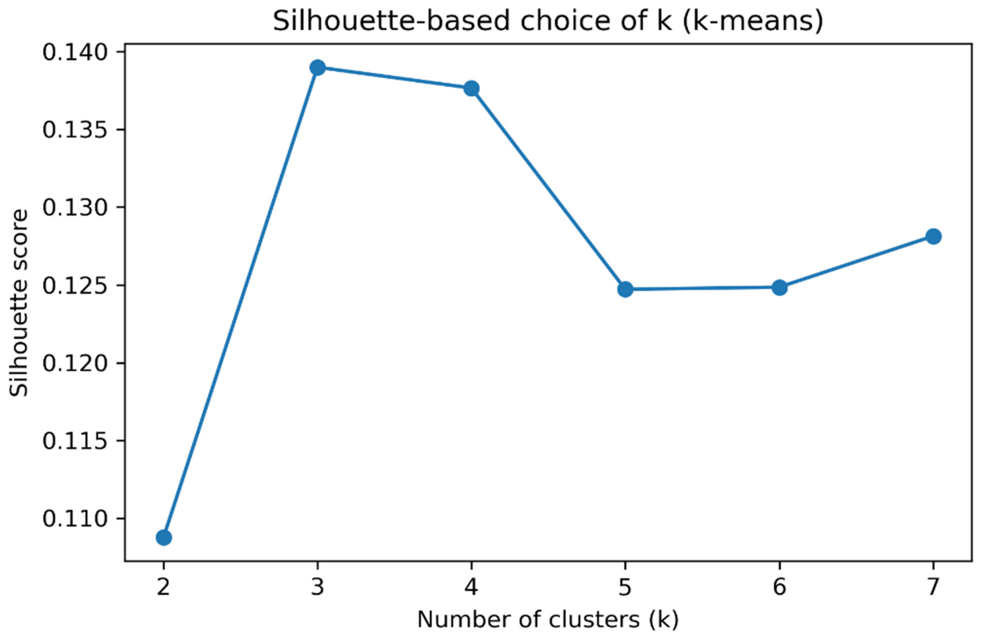 Figure 5). Numeric silhouette scores for k values from 2 to 7 are provided in