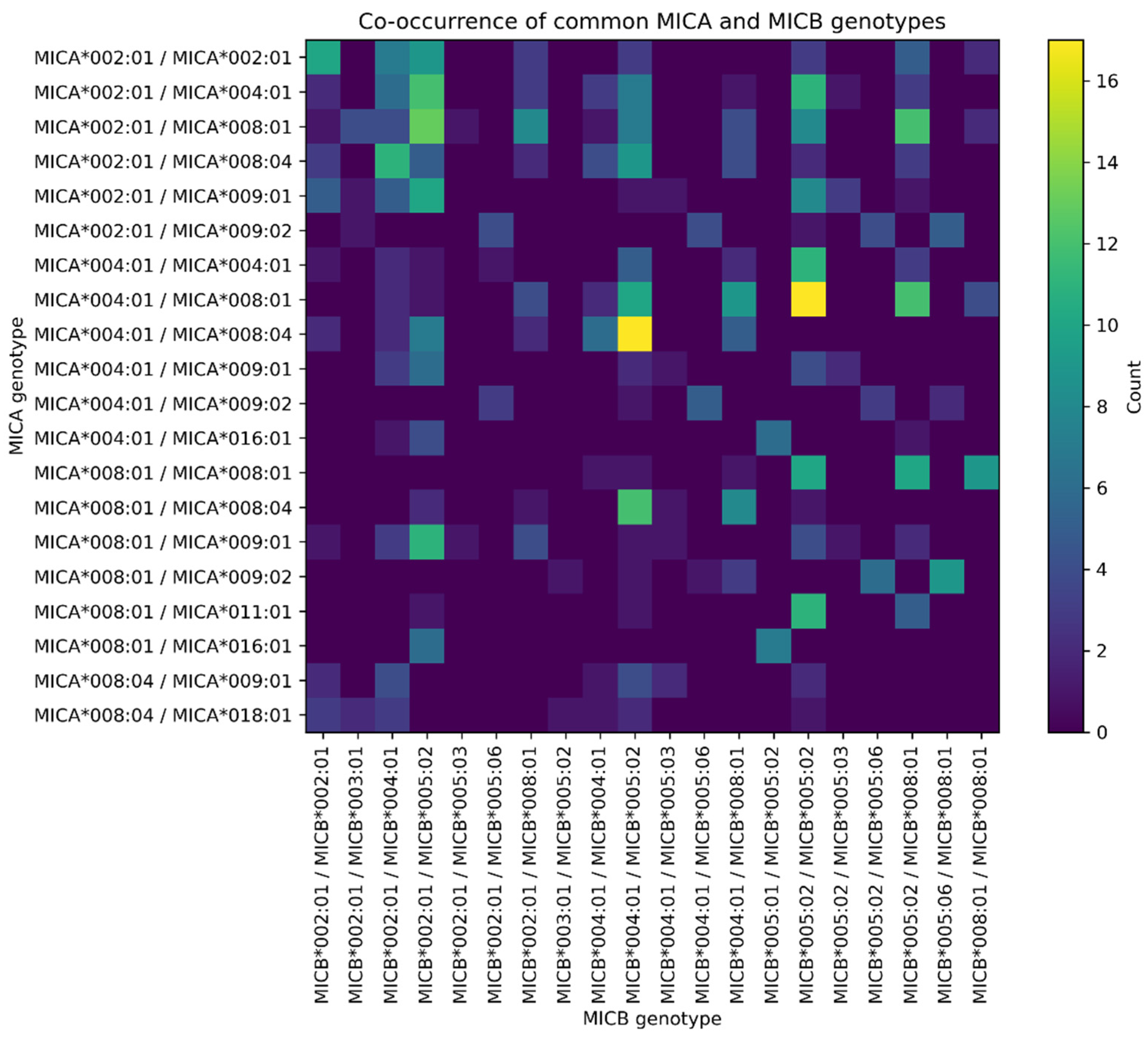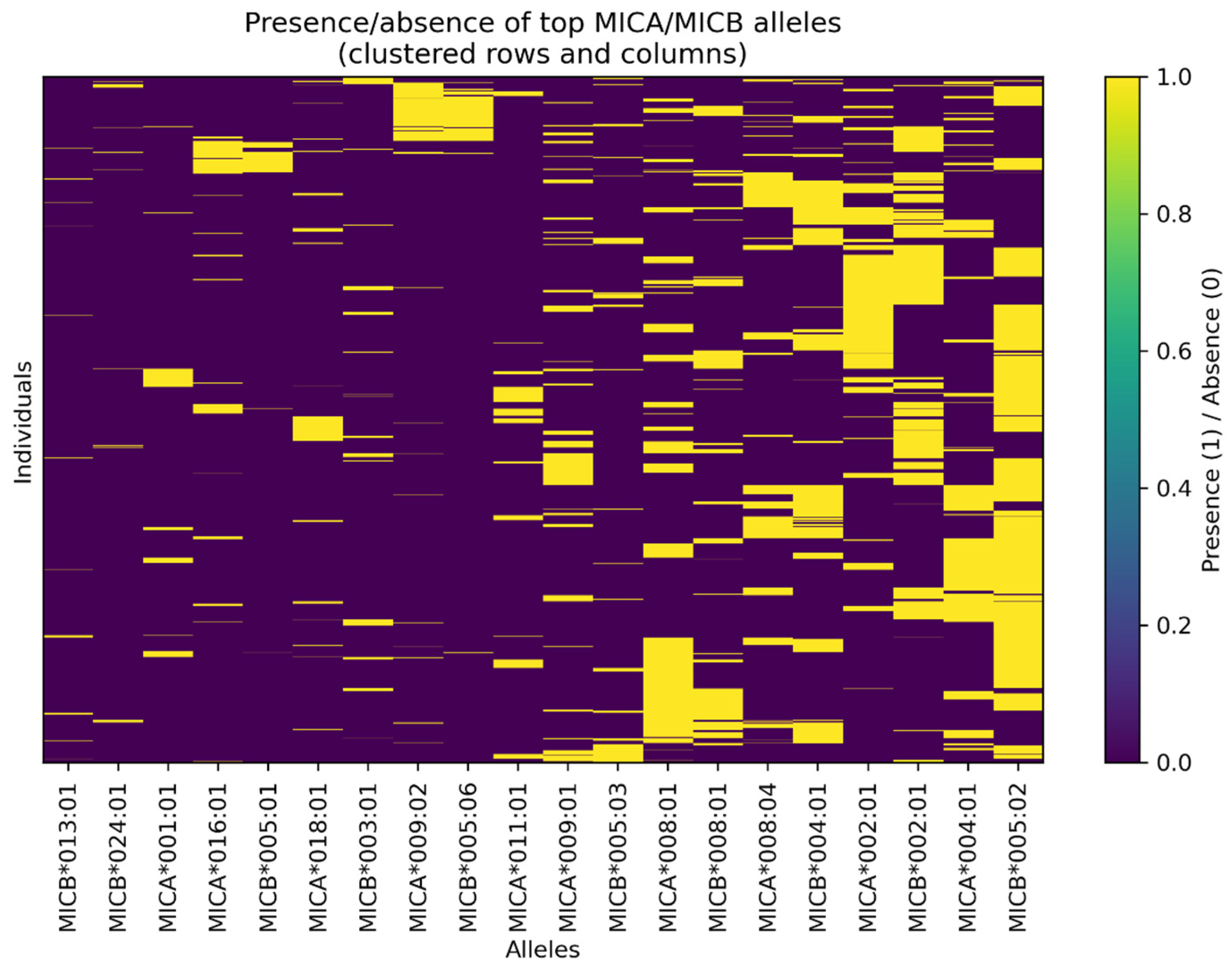 A complementary view of genotype organization was obtained by tabulating and visualizing the most common MICA and MICB genotypes in a two-dimensional matrix (