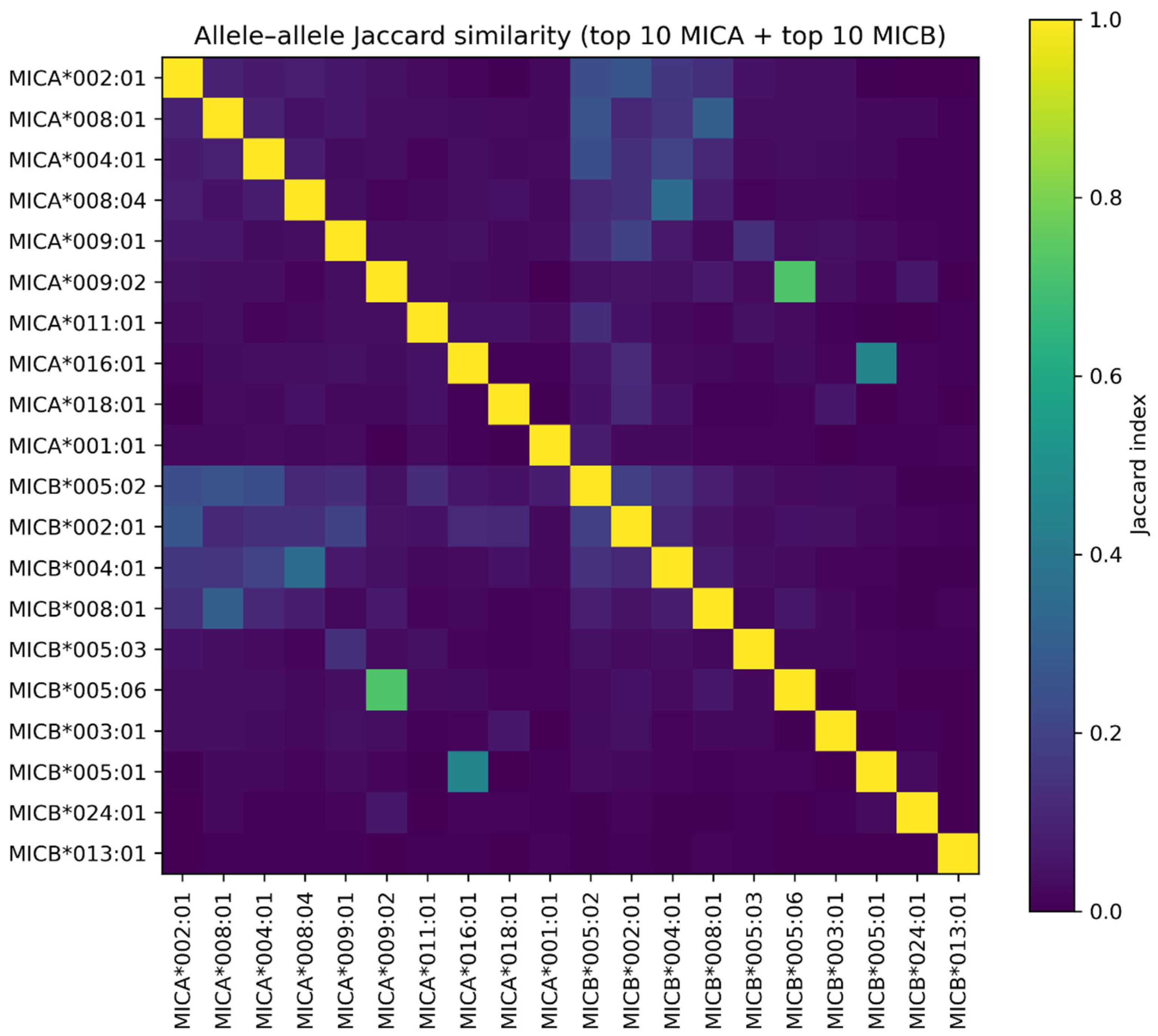 No isolated clusters of individuals were apparent, again arguing against strong hidden substructure within the cohort. In parallel, an allele–allele Jaccard similarity heatmap (
