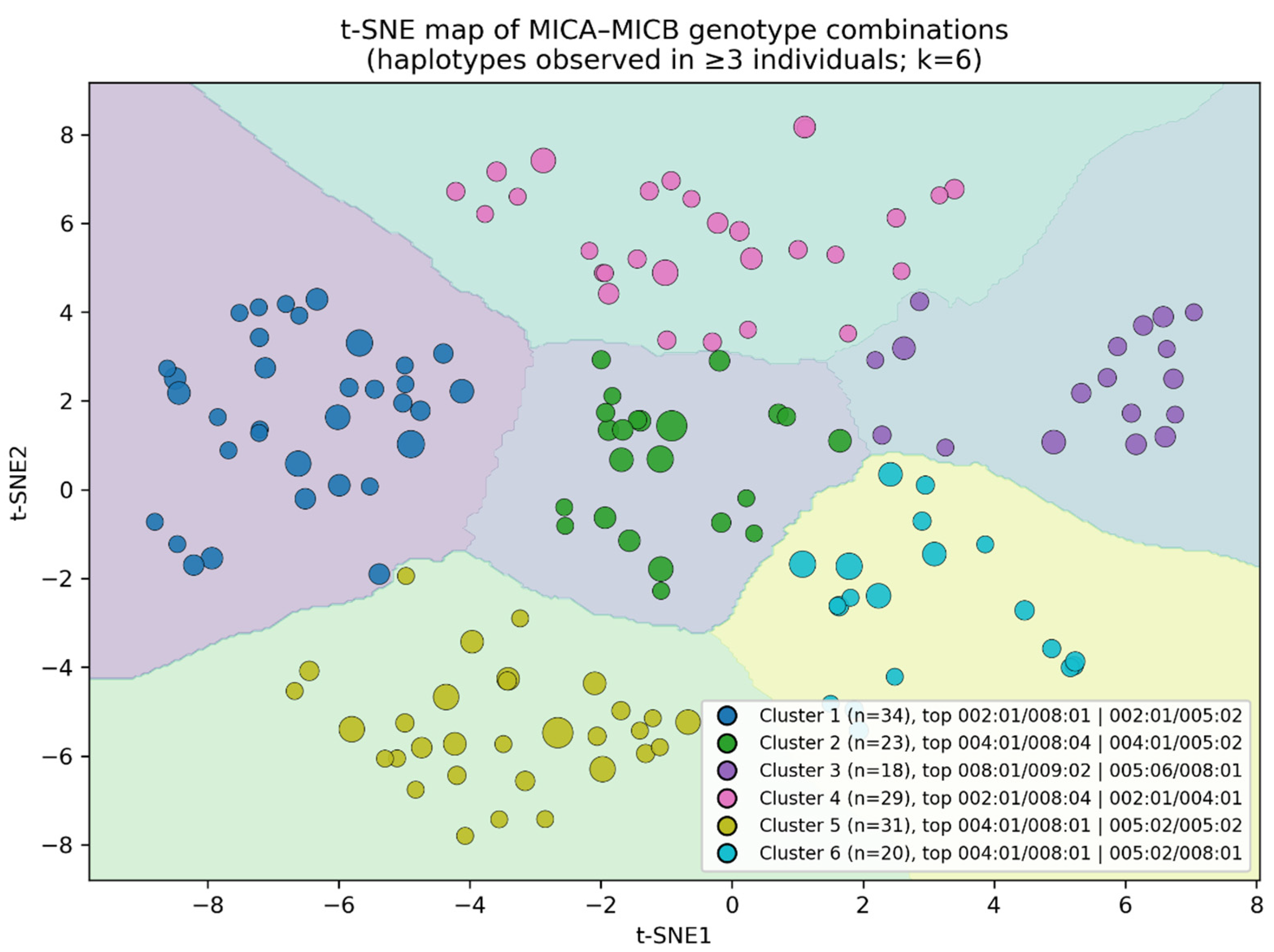 Combined MICA–MICB genotype constellations occurring in ≥3 individuals were encoded and embedded in two dimensions using t-SNE. k-means clustering was then performed in the t-SNE space. Voronoi-style decision regions were plotted to delineate haplotypic “territories”, facilitating interpretation of recurrent genotype backgrounds.