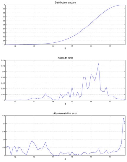Estimator of coloration’s entropy under sampling with replacement (). First graph: saddlepoint approximation to the distribution function, . Second graph: absolute error, . Third graph: absolute relative error, .