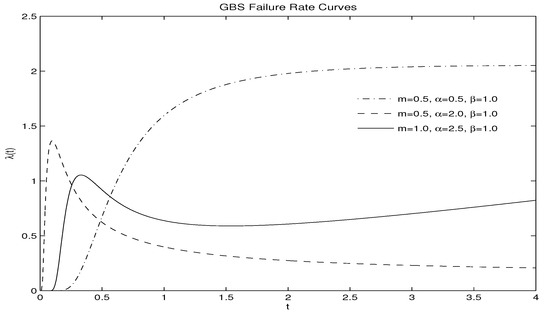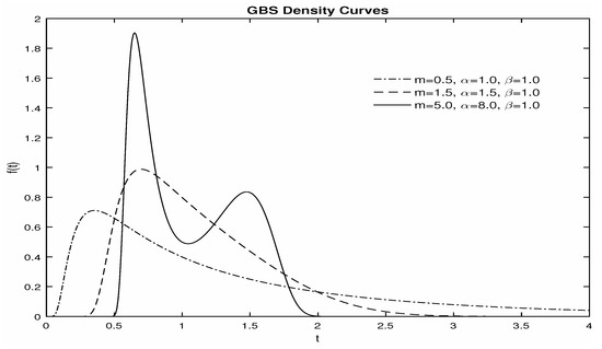 In the past decade, numerous researches have been dedicated to generalizations of the distribution and their applications. Using elliptical distributions to replace the normal function , Ref. [10] extended the BS to a very broad family of spherical distributions. This generalized BS (GBS) is a highly flexible life distribution that admits different degrees of kurtosis and asymmetry, and possesses unimodality and bimodality. As the BS distribution, the GBS distribution can be widely applied in problems involving cumulative damage, which occurs commonly in engineering, environmental, and medical studies. Various researches of the GBS have been studied on the theory and applications in [10,11,12,13], and others. Based on a multivariate elliptically symmetric distribution, a generalized multivariate BS distribution was introduced in [14], who discussed its general properties and presented the statistical inference of parameters. Most recently, Ref. [15] presented moment-type estimation methods for the parameters of the generalized bivariate BS distribution and showed the asymptotic normality of the estimators. However, the use of symmetric distributions as a generalization of the normal model is not based on empirical argument neither on physical laws. One reasonable generalization was first proposed in [16] by allowing the exponent (presently set 1/2 on the BS) to take on other values. Recently, considering the original BS distribution obtained from a homogeneous Poisson process, Ref. [17] derived the same generalized BS depending on a non-homogeneous Poisson process. To distinguish from the GBS developed in [18], this GBS is referred to as Type-II GBS, denoted by GBS-II , whose distribution and density functions are given by