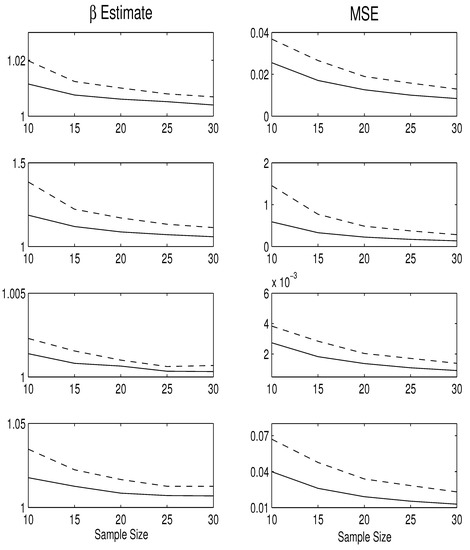 First, we carry out a simulation study to investigate the performance of two estimates of in Equation (8) and Equation (12). We fix the scale parameter and set . Under each combination of the parameter values, we generate 10,000 data sets of GBS-II random observations for each sample size to calculate the two estimates, as well as their mean square error (MSE). The comparison plot of two estimates is shown in Figure 3, where, from top to bottom, two plots correspond to the estimation results under the parameter settings , and the left and right panels demonstrate the averaged estimates and their MSEs, respectively. From these plots, one may see that the geometric mean is the better estimate since it has both smaller bias and MSE than these by the sample median , especially when sample size is small.