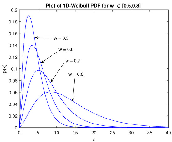Plot of the 1D-Weibull density, (7), for varying values of the parameter w.