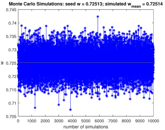 and n is the total number of random variables sampled in the data. In order to test the convergence of the estimator , i.e., (16), Monte Carlo simulations were performed using a seed value for w. The convergence of the estimator to the seed was tested and a typical result is shown in Figure 2.