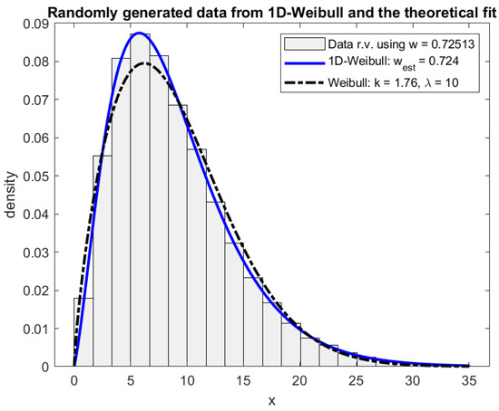 Random variables generated from the 1D-Weibull CDF are shown as a PDF histogram. The theoretical PDF is also shown which indicates that the generated variables are distributed. The Weibull is also fitted for comparison. Here is the value obtained from the estimator , i.e., (16).