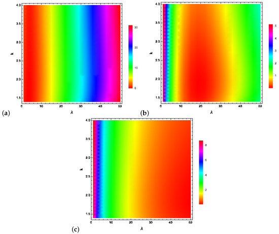 Equation (43) can be plotted as a surface in terms of the Weibull parameters . This means that for any , the corresponding point on the surface is that minimizes the relative entropy between the 1D-Weibull and Weibull distributions. Using a fixed value for as determined from (43), plots are shown for the relative entropy as a function of the Weibull parameters in Figure 4. Figure 4a shows the relative entropy for values between approximately zero to just over where the divergence between the 1D-Weibull and Weibull distributions is zero or very close to zero. This occurs when . In this region, see Figure 4a, and for the Weibull parameter values shown, the Weibull distribution can be replaced by the 1D-Weibull. In order to have a relative entropy or divergence that is close to zero or even zero for values of greater than say requires using (43) to obtain . The results are shown in Figure 4b where the relative entropy is close to zero or zero everywhere for approximately . Finally, small to zero divergence for higher values of the Weibull scale parameter, , can be achieved when as the results of Figure 4c show. Note that in all cases, the shape parameter values of interest for the Weibull distribution are covered, i.e., .