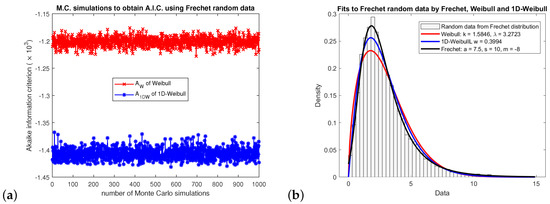 Plot (a) shows Monte Carlo simulations to obtain the AIC for the 1D-Weibull and Weibull distributions on random data generated from the three parameter Frechet distribution. Plot (b) shows a typical density histogram obtained from randomly generated Frechet data and fits to it by the densities.