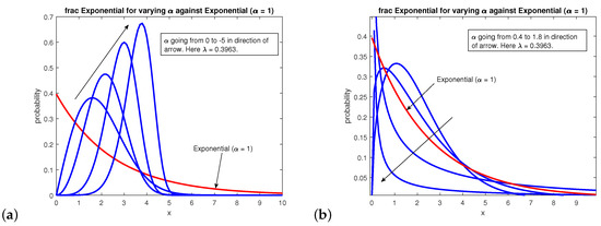 Notice that when both the CDF and PDF collapse to the standard versions. Hence the fractional two-parameter Exponential also has the same performance characteristics as the standard Exponential in addition to its wider applicability due to the second parameter . The reason why the modulus is required is because the parameter can also take any value that is real or complex . This ensures that and avoids complex values. An important property that (58) must have if it is indeed a density is that it’s integral must be unity, otherwise it is not a probability density. It is easy to establish this since