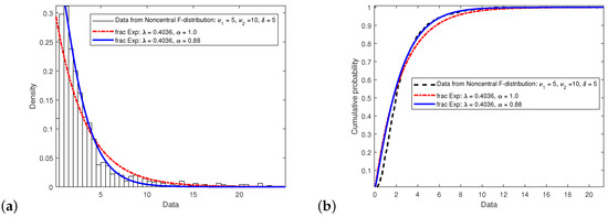 Data was generated using the non-local F-distribution with degree of freedom parameters , and locality parameter . Figure (a) shows the density of F-data and fits to it using the Exponential distribution () and the (fractional) two parameter Exponential distribution with . In all cases the Exponential parameter . Figure (b) shows the CDF of the distributions.