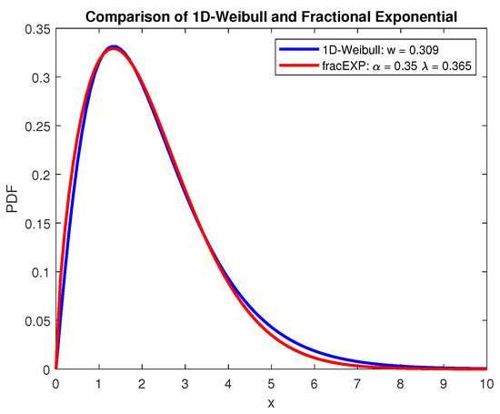 The 1D-Weibull and (fractional) two-parameter Exponential densities are plotted for comparison using non-optimal parameters.